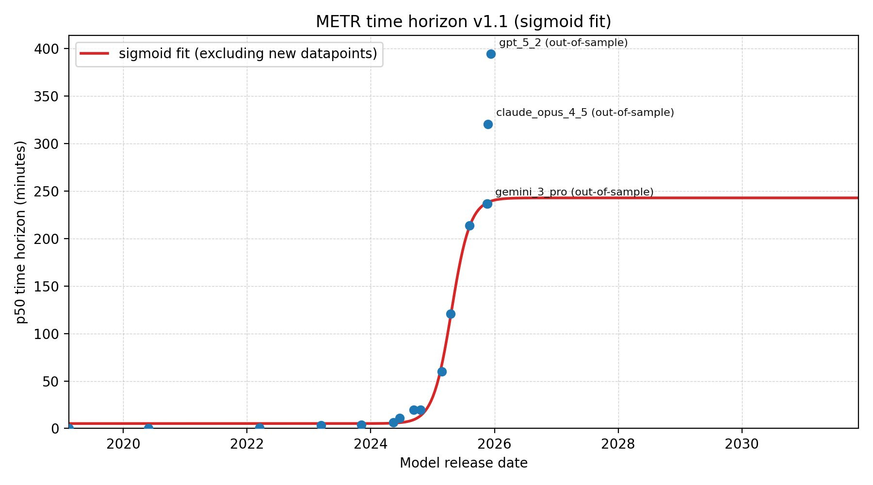 The phenomenon of people repeatedly underestimating the pace of AI progress is an example of exponential blindness. An amusing case of this was seen with the recent release of a preprint from UPenn researchers that attempted to cast doubt on METR’s forecast of AI’s accuracy on long-horizon tasks (our current best measure of AI autonomy). While a simple extrapolation suggests the task-length that an AI can reliably perform is doubling every 5-7 months, the UPenn researchers argued that the apparent exponential is actually an S-curve on the verge of plateauing. That same day, OpenAI and Anthropic both released new models that showed the exponential trend was alive and well, effectively debunking the paper in real time.